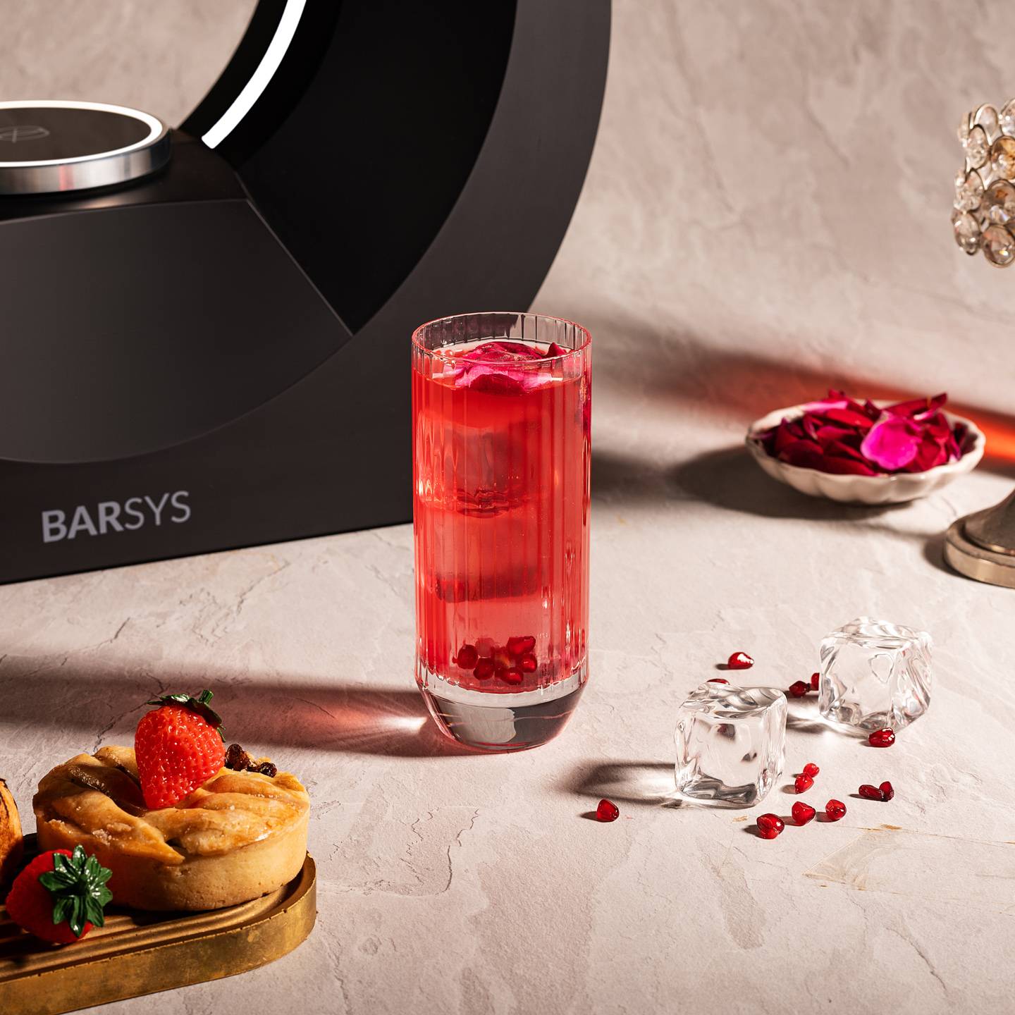 A playful and vibrant cocktail with the tartness of pomegranate and the sweetness of strawberries.