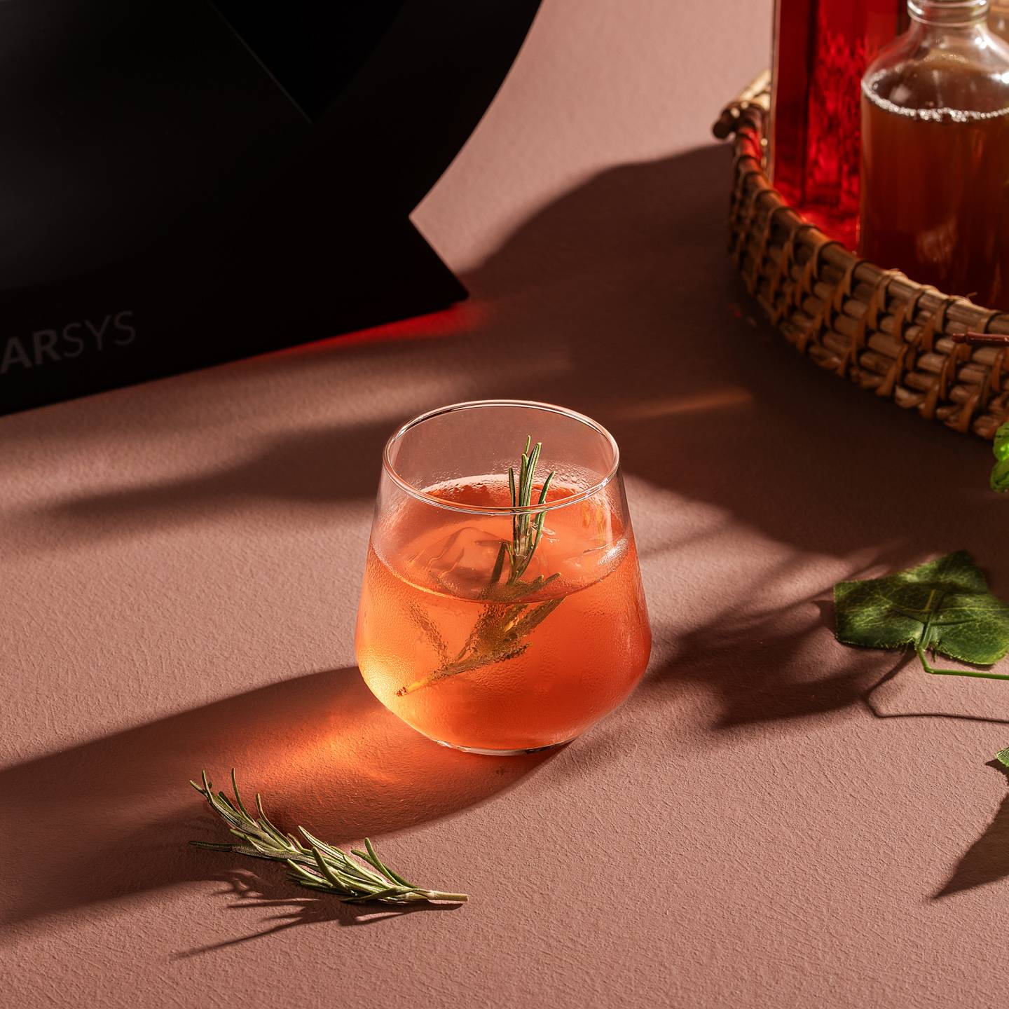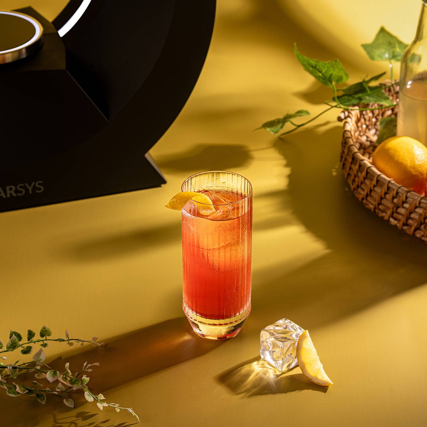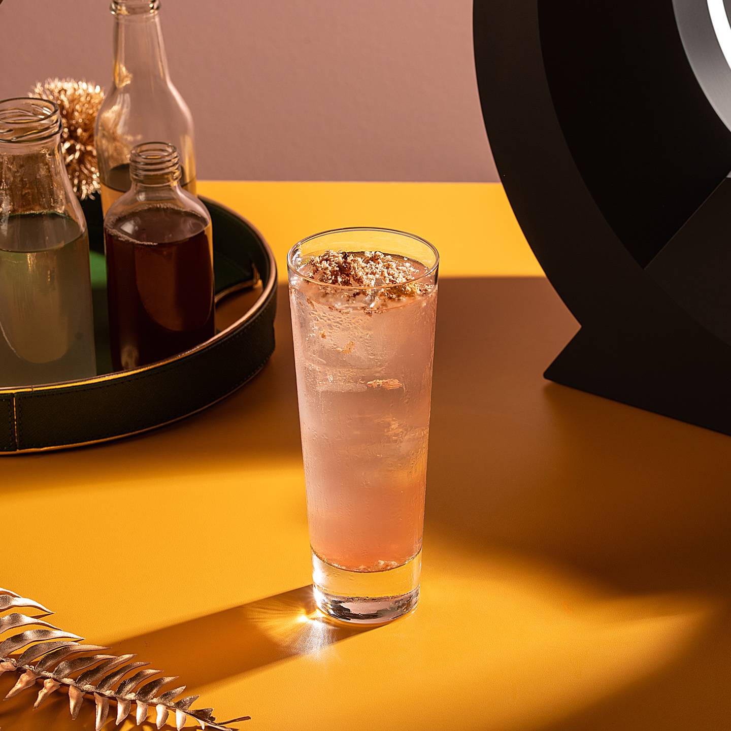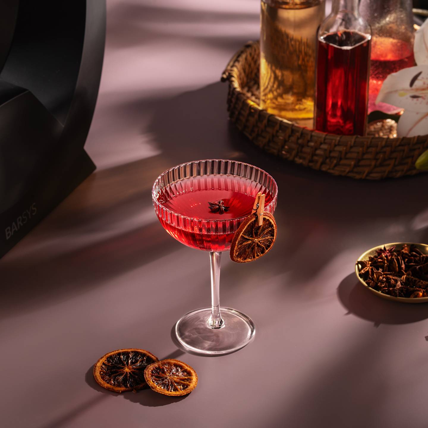 A floral, lightly spiced, and effervescent mocktail with a stunning deep red hue and delicate bubbles.