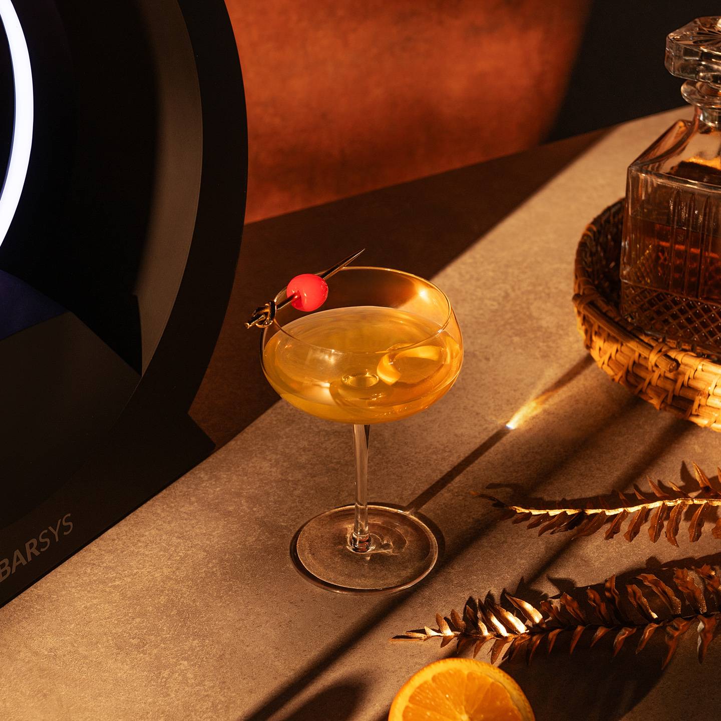 A deep and warming cocktail featuring aged rum, amaretto, and citrus spice in a Manhattan-style drink.