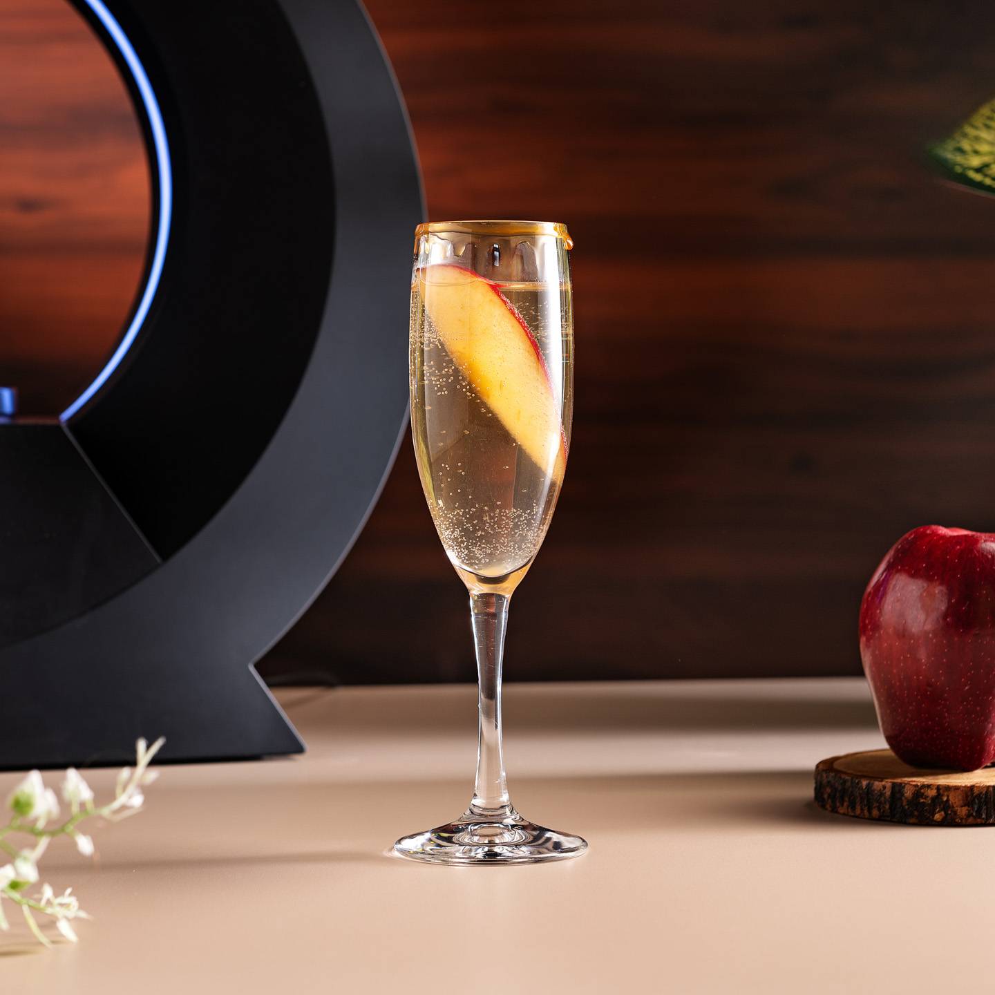 A fun, autumnal take on the classic mimosa, combining the bubbly lightness of sparkling wine with the sweet, crisp flavors of caramel and apple.