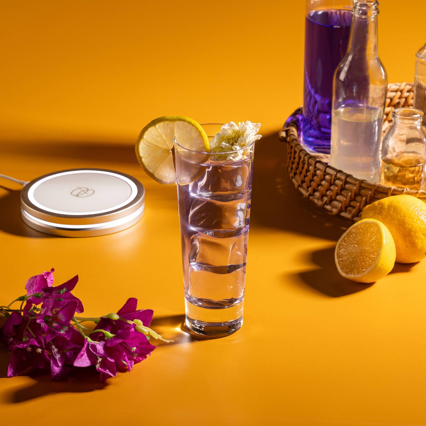 A mesmerizing Collins cocktail with a vibrant color shift from deep blue to purple, thanks to the butterfly pea flower infusion.